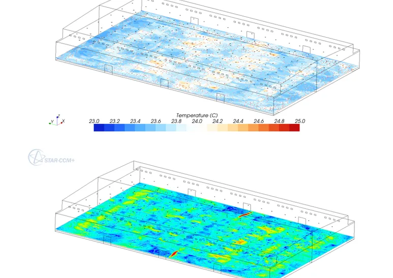 В конгрессно-выставочном центре для создания мягкого комфорта и оптимального распределения воздуха были установлены воздухораспределители на базе RU-effect в нижней части кресел Амфитеатра. Подтверждением мягкого комфорта и равномерного распределения воздуха стала процедура математического моделирования. Позже при проведении пусконаладочных работ мы провели замеры скорости воздуха. Созданная эпюра скоростей совпала с математическими моделями скоростных полей, которые были созданы на этапе проектирования. Моделирование также позволило доказать эффективность вытесняющей вентиляции, т.к. она формирует достаточно равномерную среду, а подвижность воздуха не превышает нормативные значения. Так мы убедились, что поставленная Заказчиком задача по созданию «климата вечной весны» нами успешно решена.